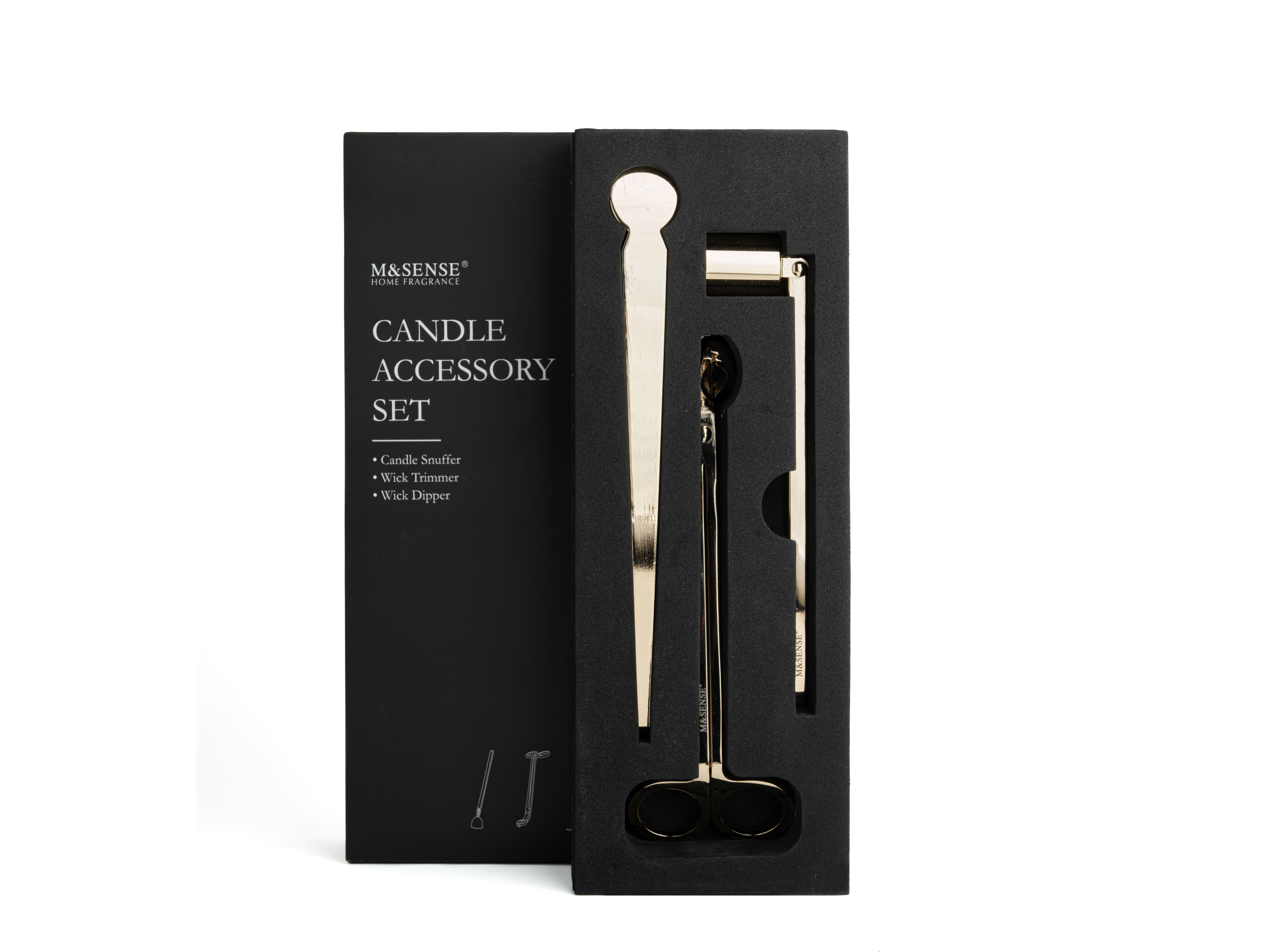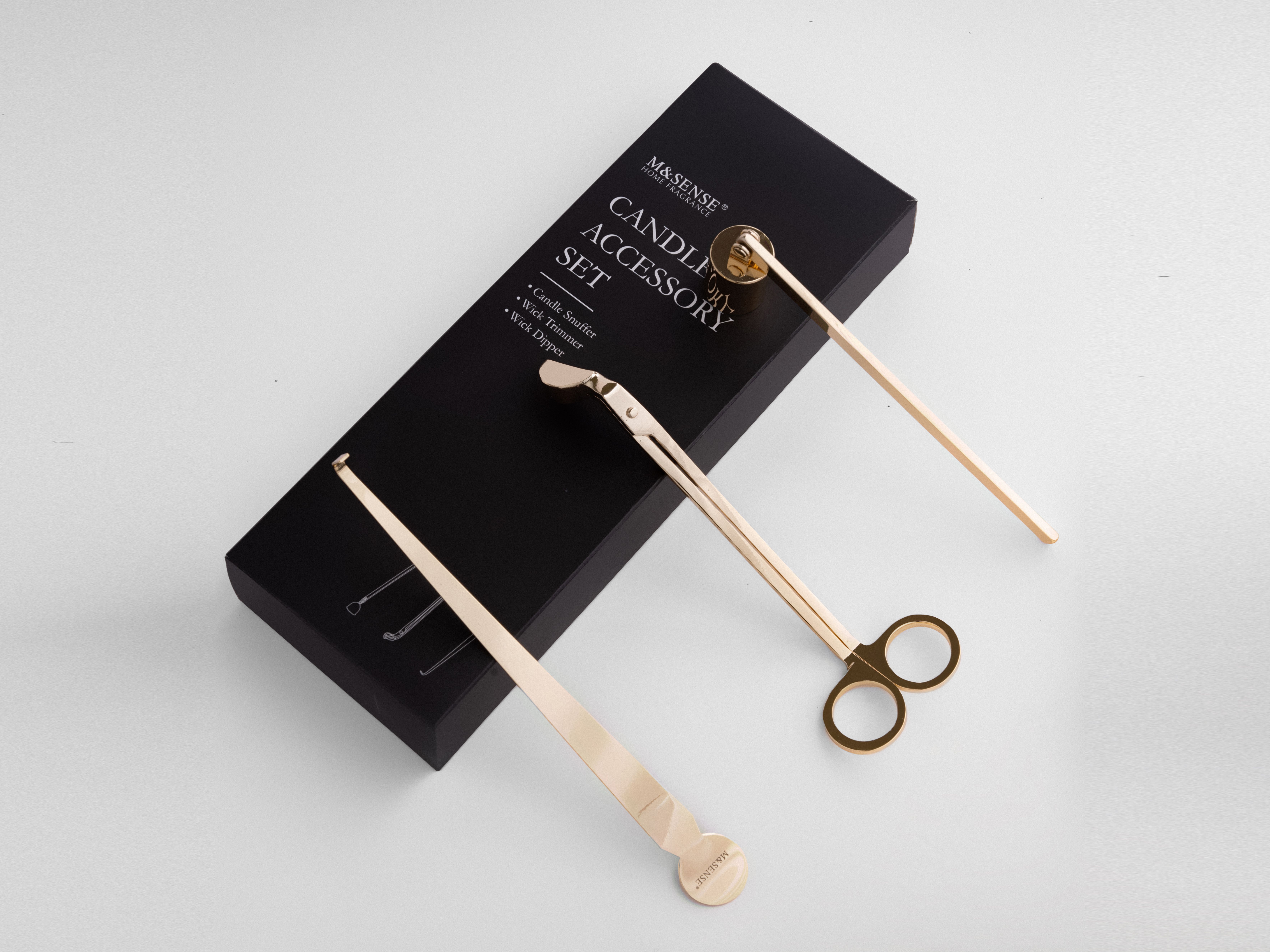 Eleve su experiencia con las velas con nuestro elegante juego de accesorios para velas M&Sense. Este juego de herramientas para velas, fabricado en acero inoxidable duradero con revestimiento negro, garantiza cortes limpios y una combustión más segura y sin hollín. El diseño elegante y el empaque exquisito lo convierten en un regalo perfecto para cualquier entusiasta de las velas.