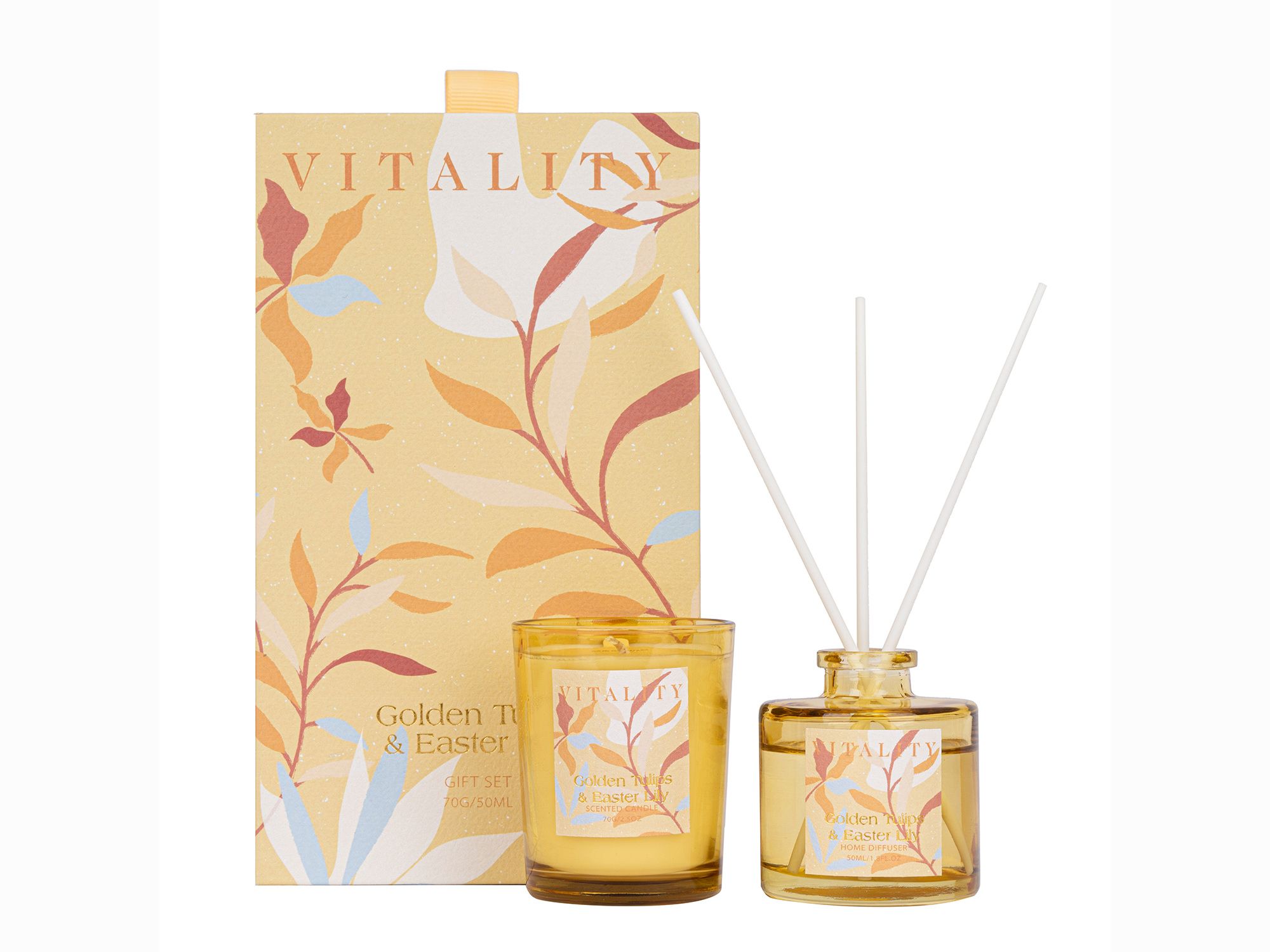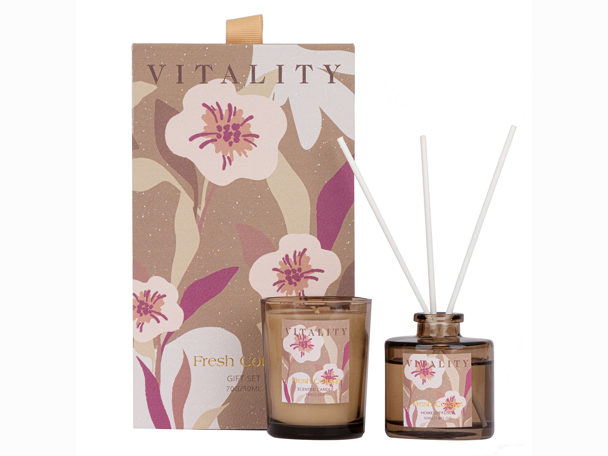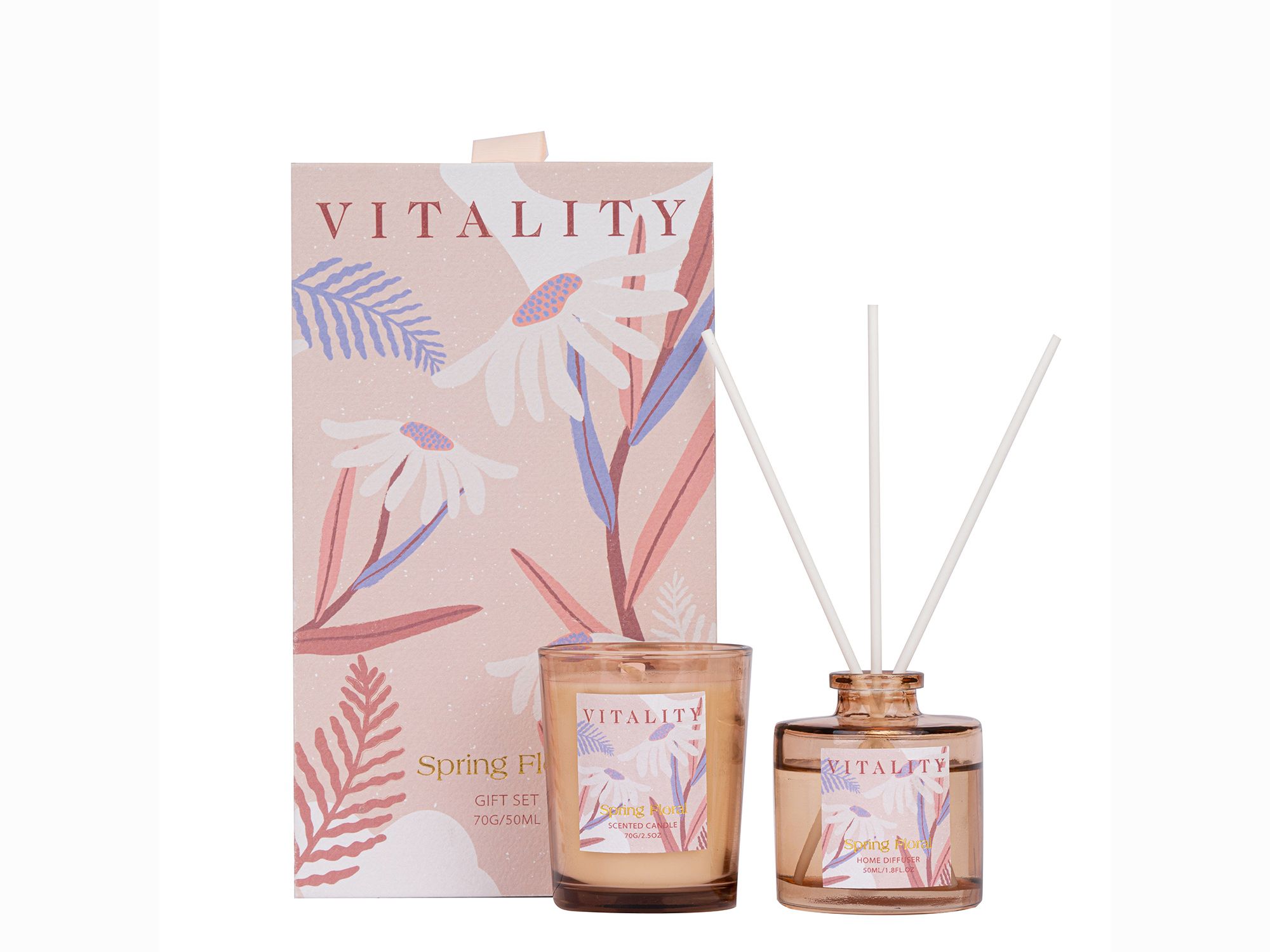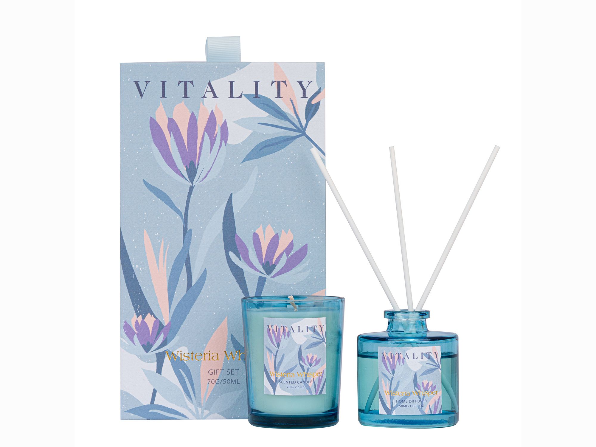 Combinado con una vela en frasco de vidrio transparente teñido y un difusor doméstico en la misma paleta de colores, con diferentes experiencias y el mismo aroma, es perfecto para regalar y para uso personal.