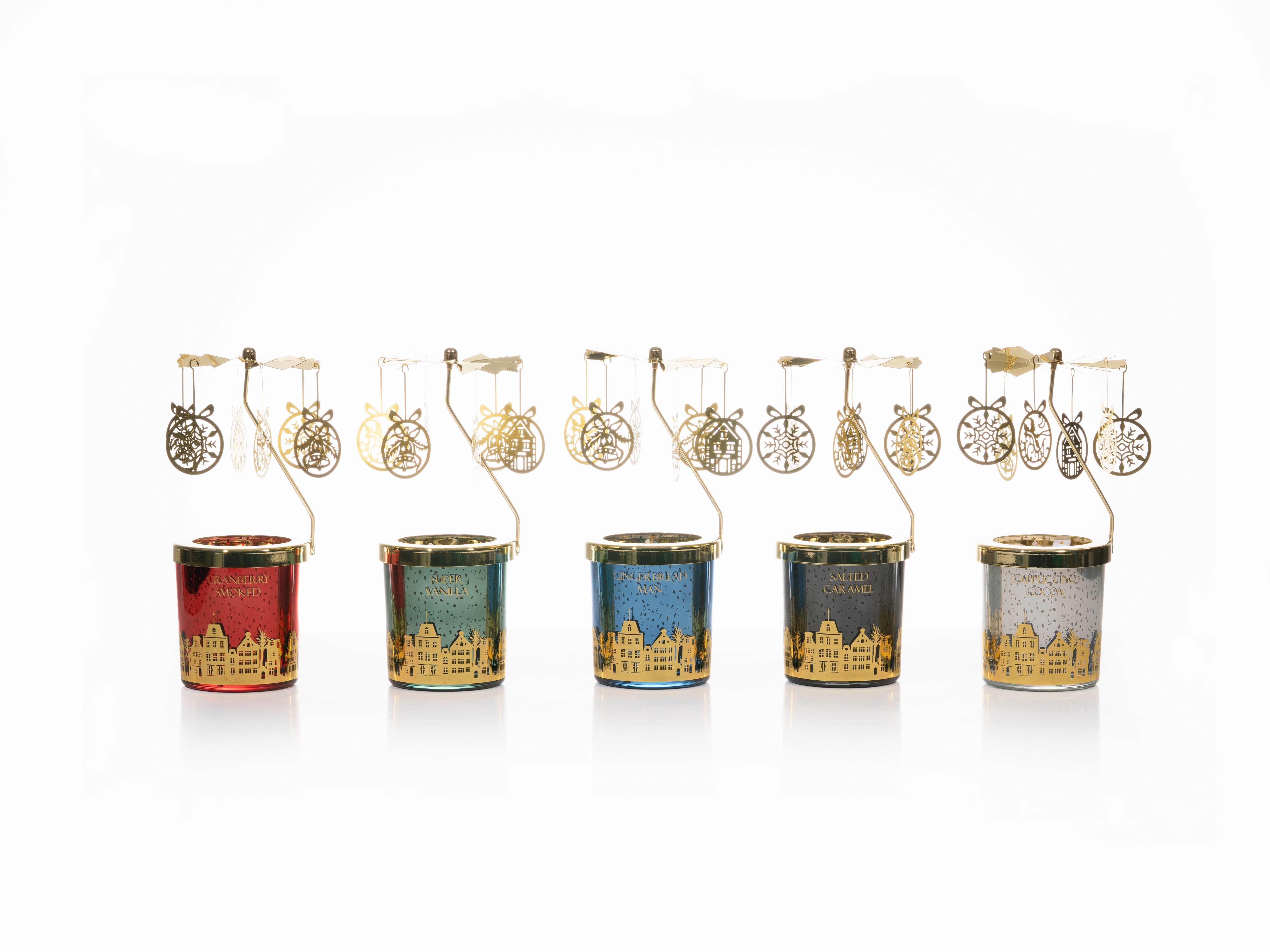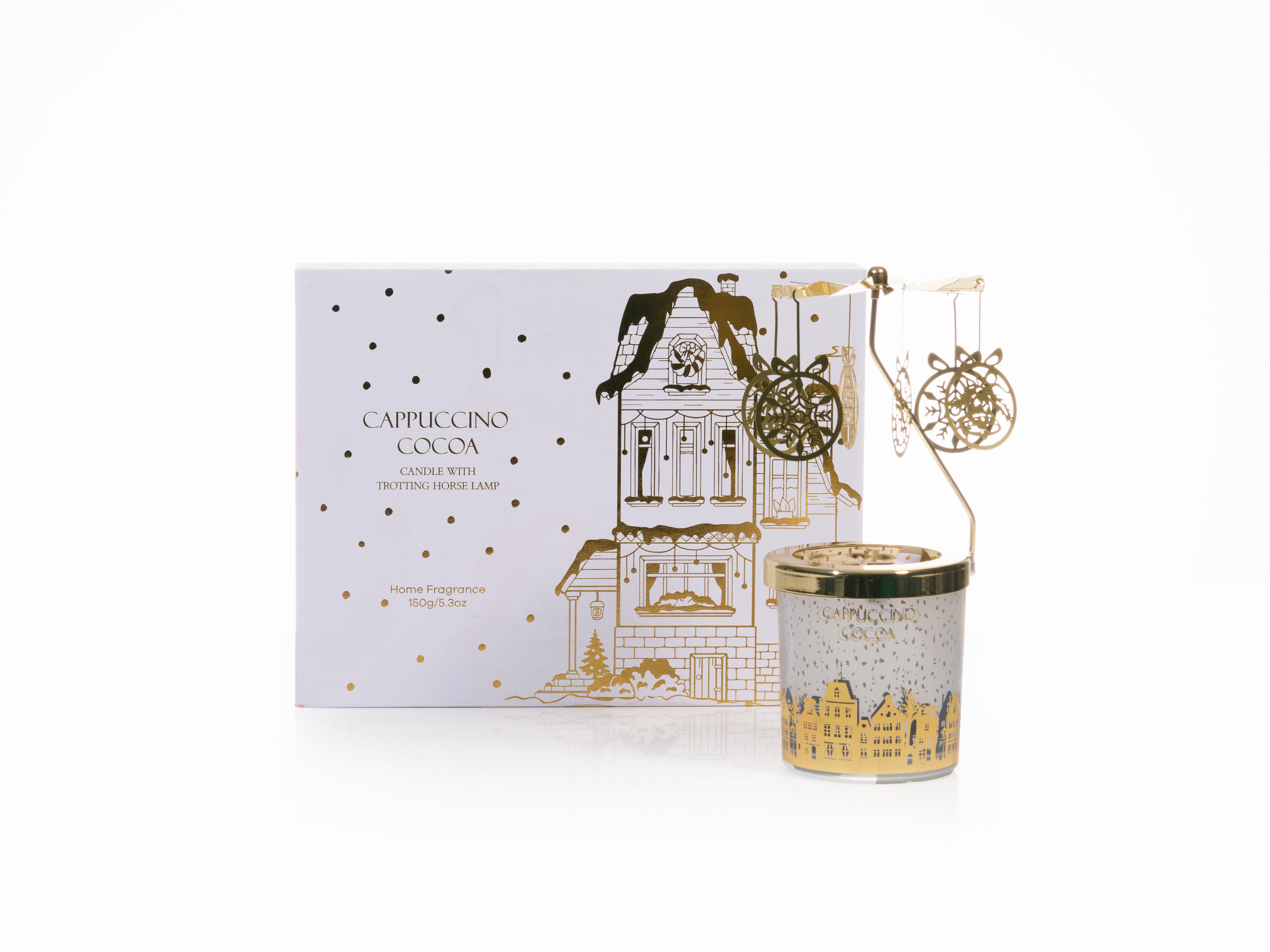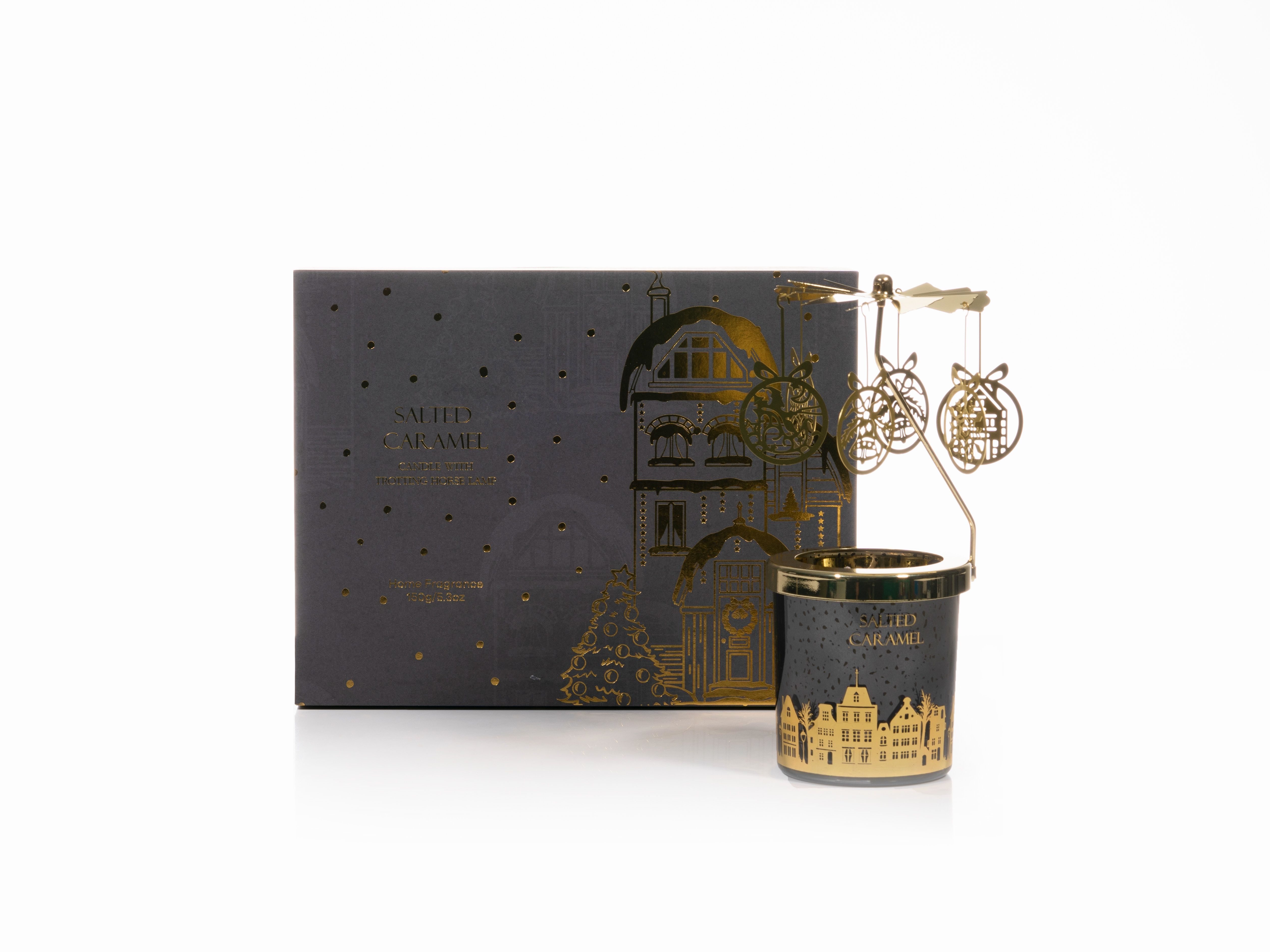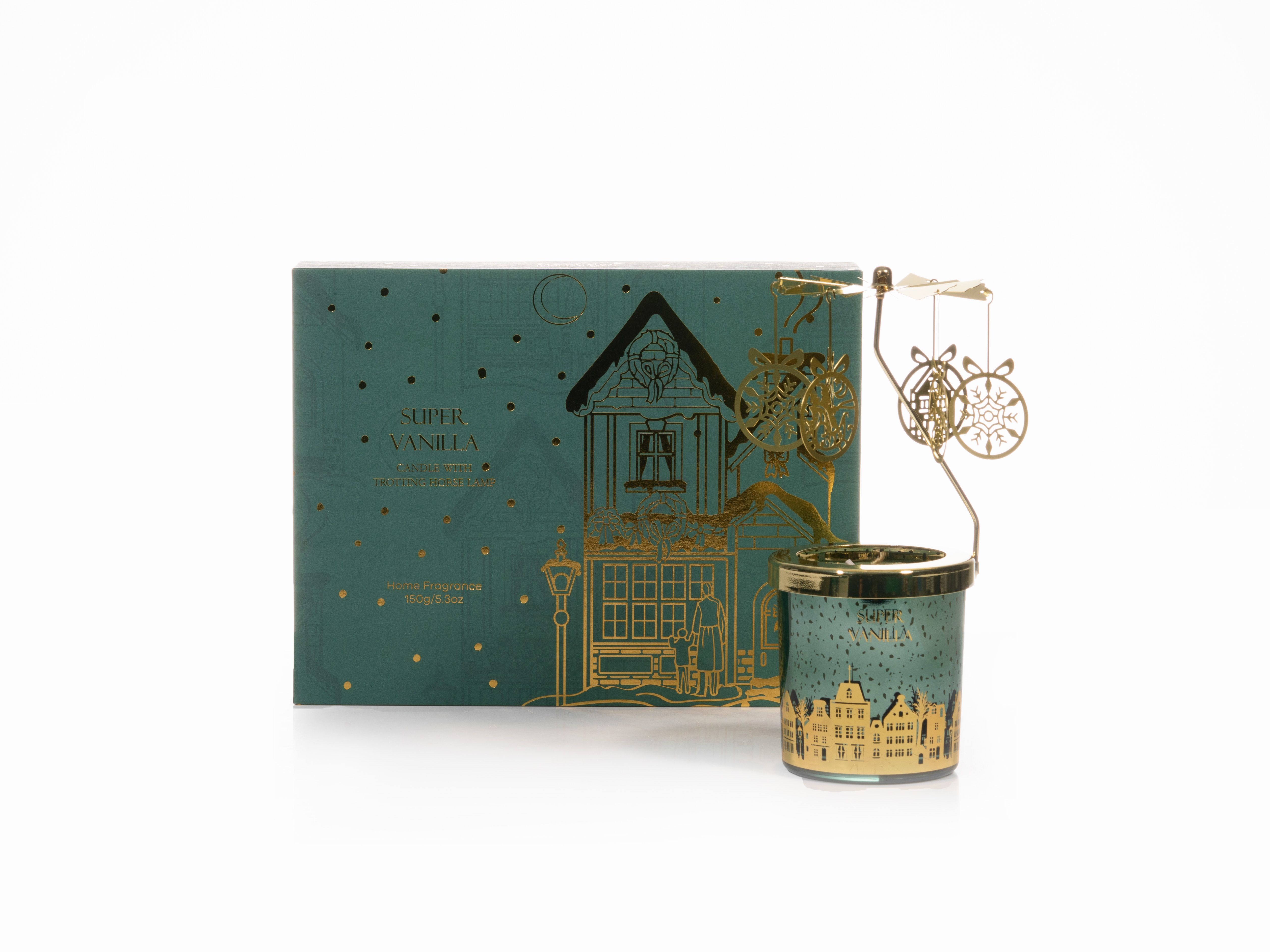 Descubra nuestra encantadora vela perfumada con lámpara de caballo al trote, una vela festiva de Navidad diseñada para darle un toque de elegancia y tradición a sus celebraciones navideñas. Para celebrar el fin de año, las cajas de campanas, copos de nieve y regalos se transforman en amuletos de velas de carrusel, agregando un elemento caprichoso y dinámico a su decoración. Infundido con una mezcla de fragancias de temporada, llena su espacio con los aromas cálidos y acogedores de la temporada navideña.